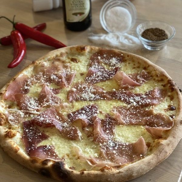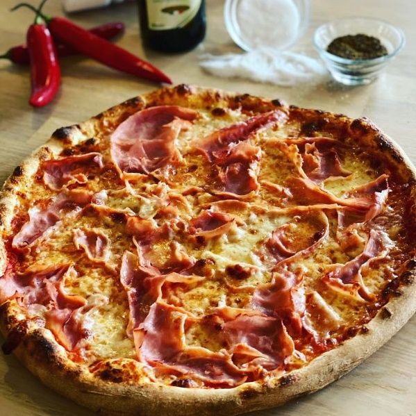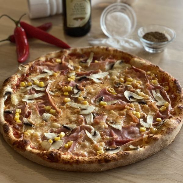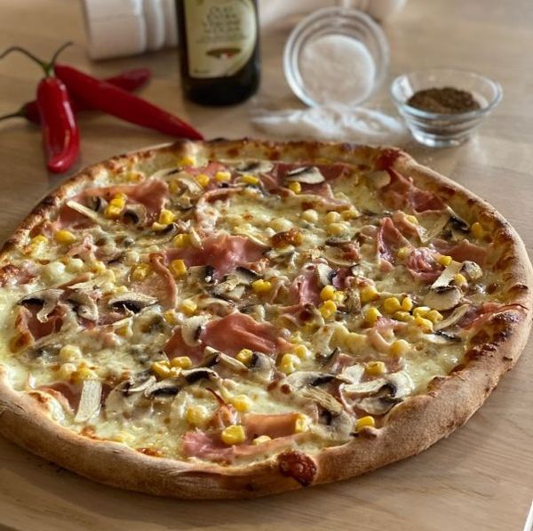 Smetanový bešamel, mozzarella, prosciutto cotto-dušená italská šunka, žampiony, kukuřice