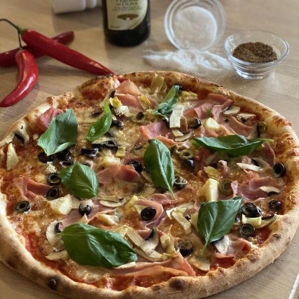 sugo di pomodoro, mozzarella, prosciutto cotto, artyčoky, žampiony, olivy, bazalka