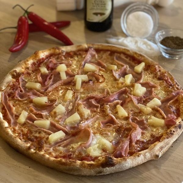 sugo di pomodoro, mozzarella, dušená šunka, ananas