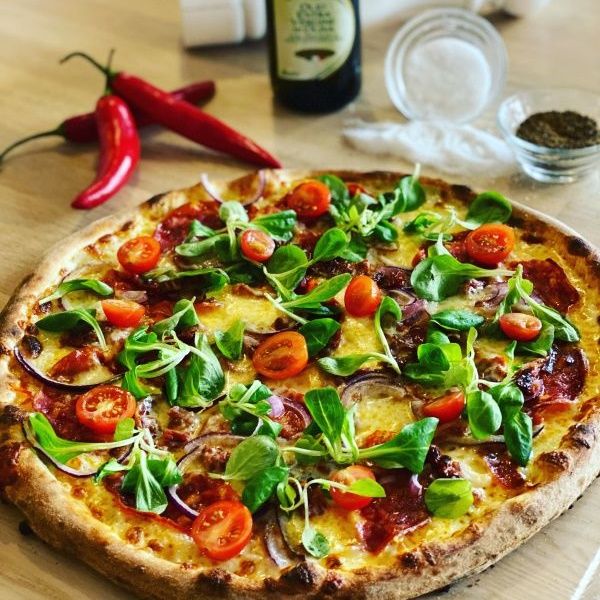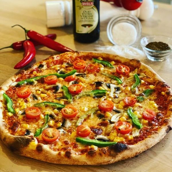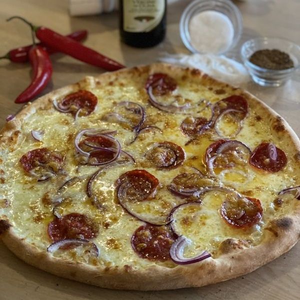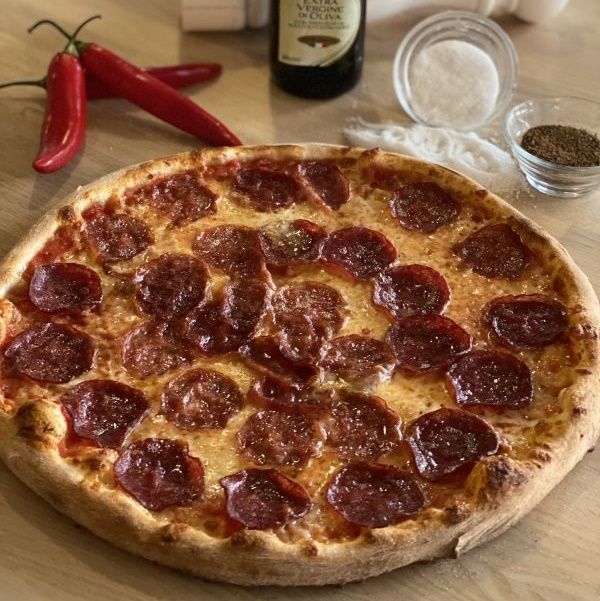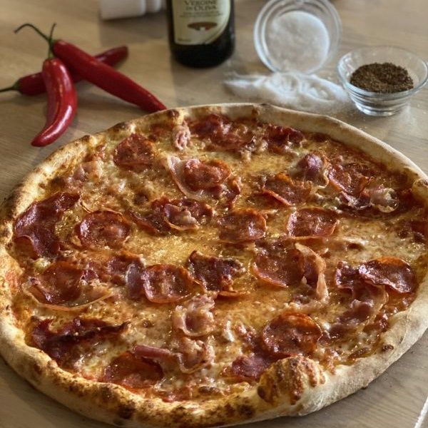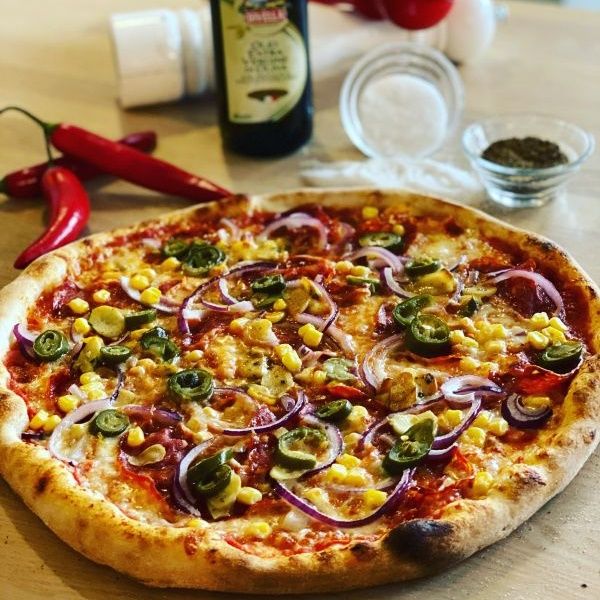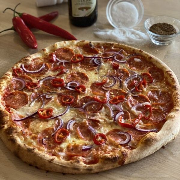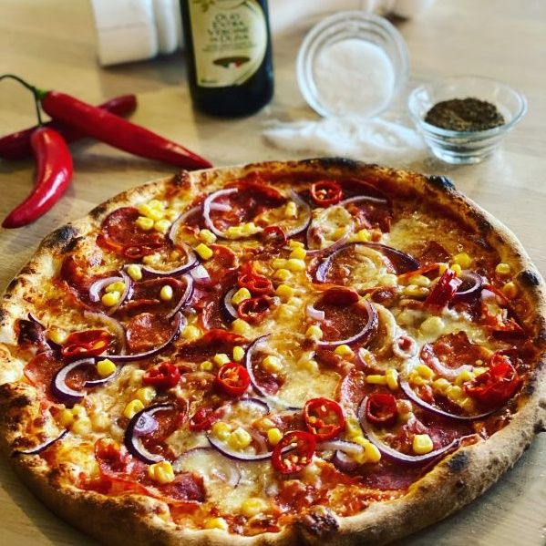 sugo di pomodoro, mozzarella, salsiccia napoli dritta (pikantní neapolská klobása), ventricine, kukuřice, chilli papričky, červená cibule