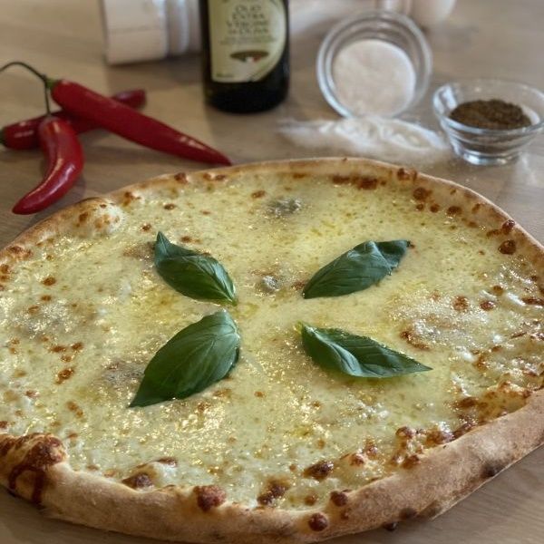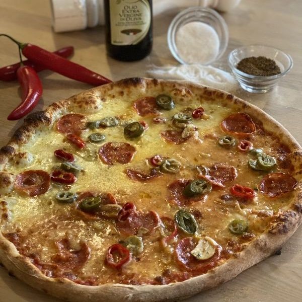 ½ sugo di pomodoro, ½ smetanový bešamel, tvarůžky, gorgonzola, česnek na plátky, chilli (fresh), salsiccia napoli drita-pikantní neapolská klobása, papričky Jalapeño