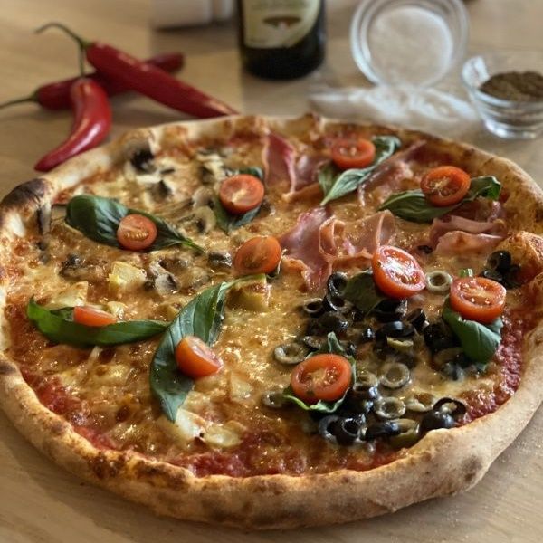sugo di pomodoro, mozzarella, artyčoky, proscuitto cotto-dušená italská šunka, žampiony, olivy, cherry rajčátka, bazalka