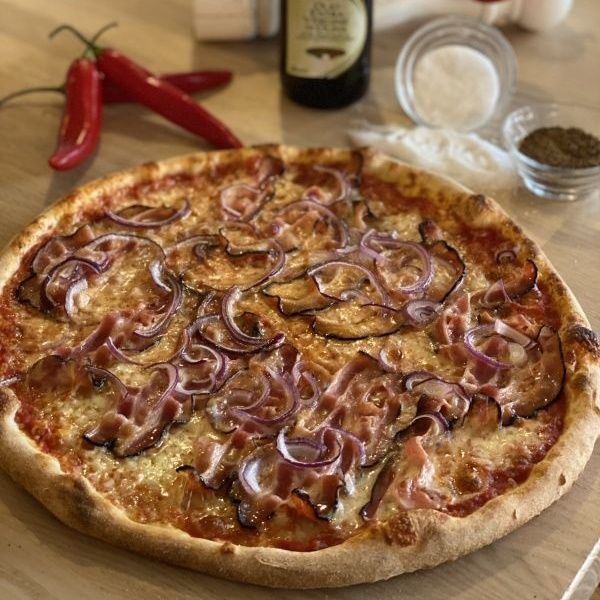 smetanový bešamel, mozzarella, salám paprikáš, uzený sýr, červená cibule