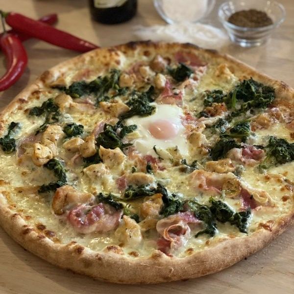 smetanový bešamel, špenát, česnek na plátky, kuřecí kousky, pancetta arotolata-italský sušený bok, vejce, mozzarella