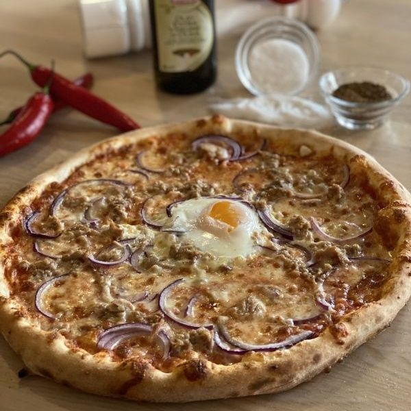 sugo di pomodoro, mozzarella, červená cibule, tuňák, vejce