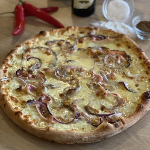 smetanový bešamel, mozzarella, tvarůžky, anglická slanina, červená cibule